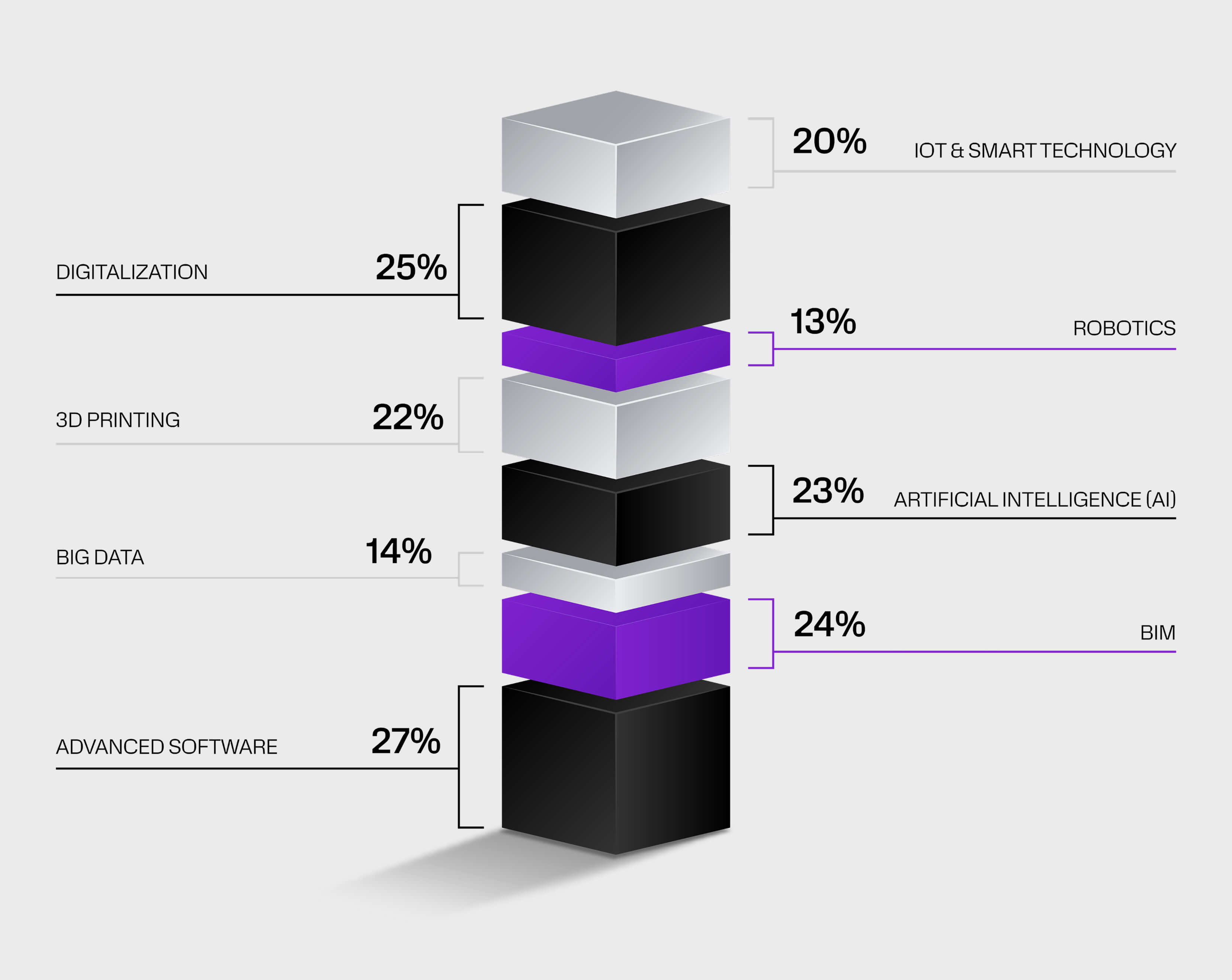 Шесть описанных трендов — это больше не концепции из будущего. Это реальные силы, которые прямо сейчас меняют строительные площадки. Лидером по внедрению является специализированное программное обеспечение (27%), за ним следуют BIM-технологии (24%), искусственный интеллект (23%) и IoT (20%).